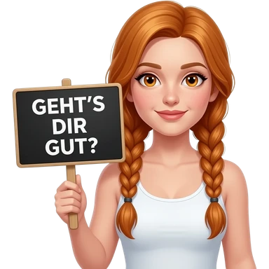 sexy girl with long ginger braids and ginger eyes wearing a white tanktop is holding a black sign with GEHT'S DIR GUT? written on it emoji