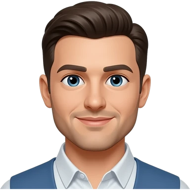 Guy with grey hair tilting his head with a blue shirt smiling emoji