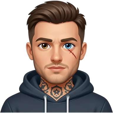 Guy, less beard, tattoos, hoodie, left eye dark brown, right eye light blue, scar across the right eye emoji