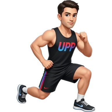 no check marks on: guy-wearing- black-tank-top-and-black-shorts-doing-lunge-with-"UPP" written on both shirt and shorts/thigh- in blue - red - purple gradient emoji
