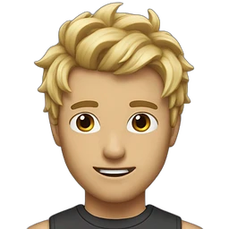 Person with blue eyes and messed up short blonde hair and tanned with a good smile and black dot earrings emoji