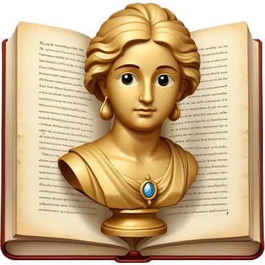An icon featuring a classical bust, a book, and a question mark, symbolizing philosophy. The design includes a scroll with ancient text, evoking deep thought and intellectual inquiry. Transparent background highlights the search for knowledge and meaning emoji