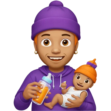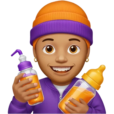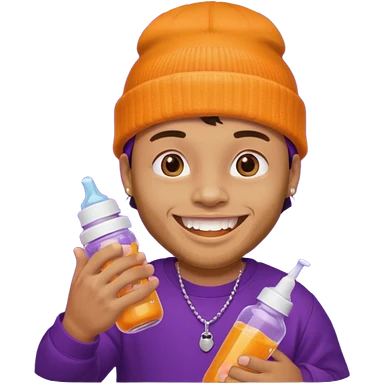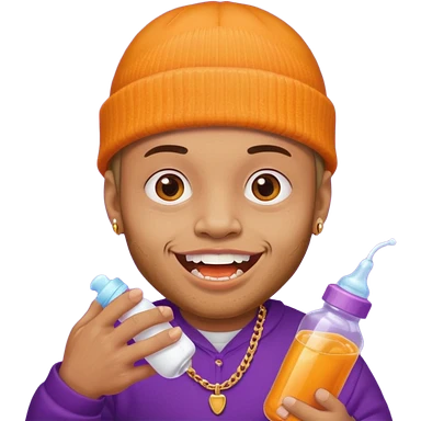 guy with orange beanie with gold teeth grillz holging a baby bottle with purple liquid emoji