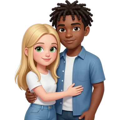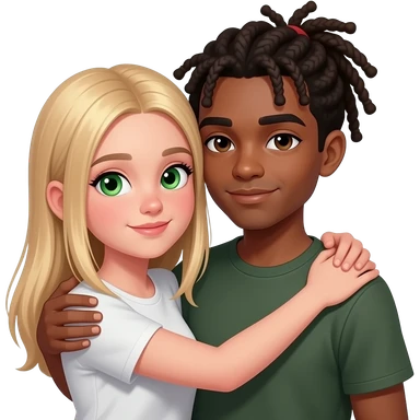 teen white girl with straight blonde hair and green eyes hugging teen black guy with dreads and no facial hair emoji