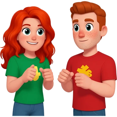 Reddish light brown haired guy in his early twenties with greenish eyes, light skin and freckles holding hands with a dark brown haired girl in her early twenties with dark eyes and a light mid tone skin emoji