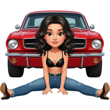 Pale girl with wavy jet black hair and brown eyes in front of a red ford mustang 1968 coupe. Girl wearing black pushup bra, jeans and heels with visible toes. Legs wide spread. emoji