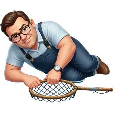a fat guy with glasses that fell into the water lying on the ground with a fishing net emoji