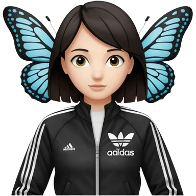 A girl with medium length, dark hair, fair skin. The style is a butterfly cut and wore black Adidas track jacket with white stripes on the sleeves. It has a full zipper down the front, a stand-up collar, and the Adidas logo on the right chest emoji emoji