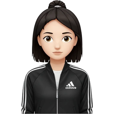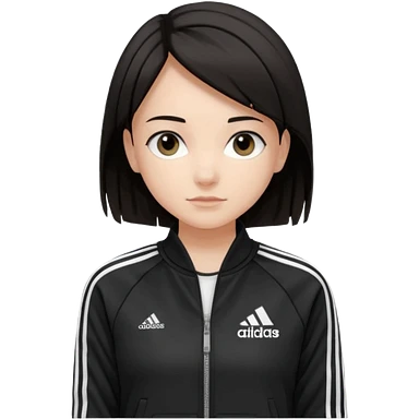 A girl with medium length, dark hair, fair skin. The style is a soft, layered cut that falls around her shoulders. wore black Adidas track jacket with white stripes on the sleeves. It has a full zipper down the front, a stand-up collar, and the Adidas logo on the right chest emoji emoji