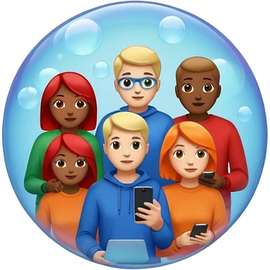 Multiple people inside colorful transparent bubbles, each using a smartphone or laptop. The bubbles are blue, red, orange, and green, with a minimalist cityscape in the background. Realistic emoji style. emoji