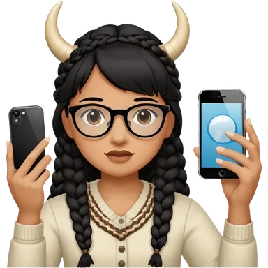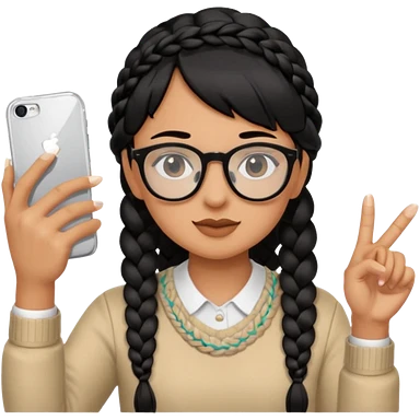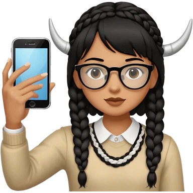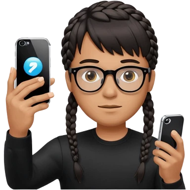 He's wearing black, left braided hair, full bangs, bangs and glasses, and taking a mirror selfie with a white iPhone emoji