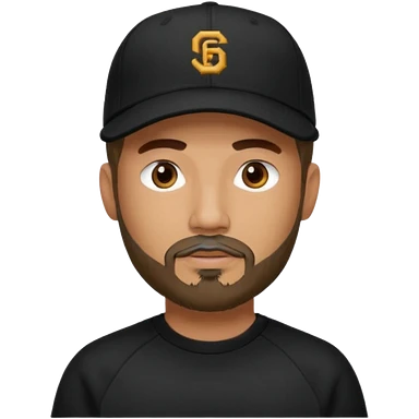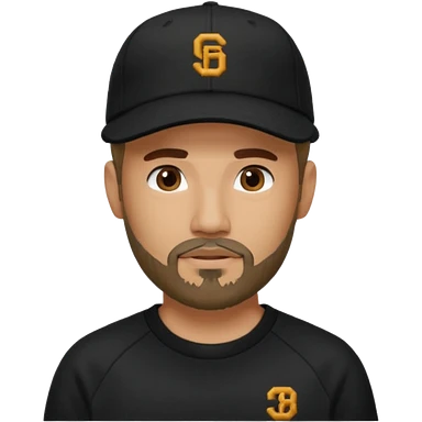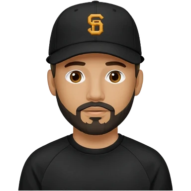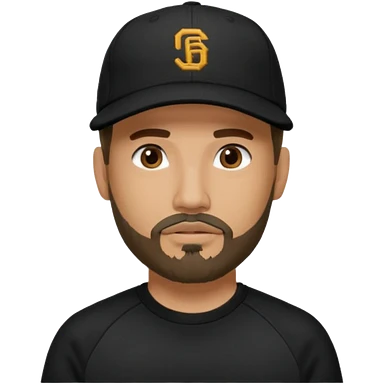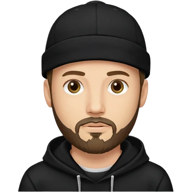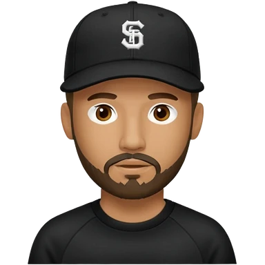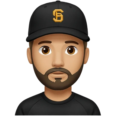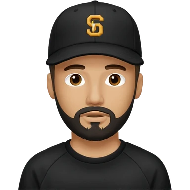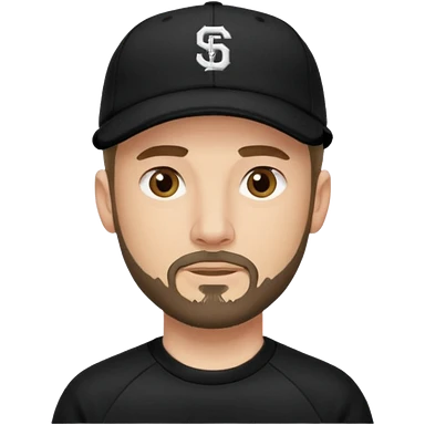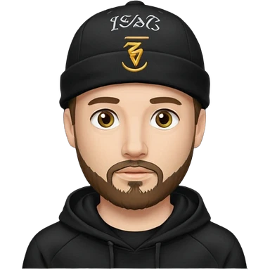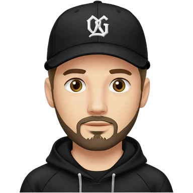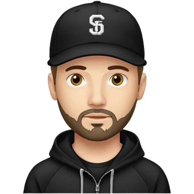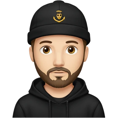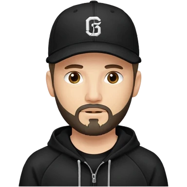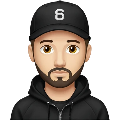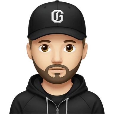 Hombre de ojos claros, con barba fina y perilla, gorra negra bordada, y sudadera negra emoji