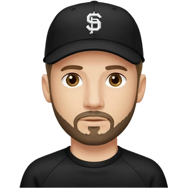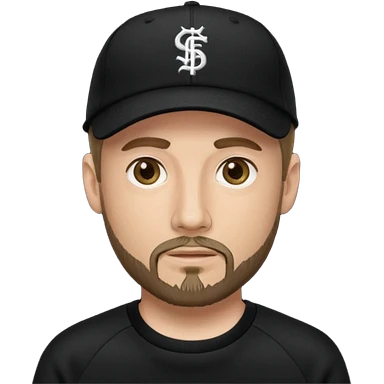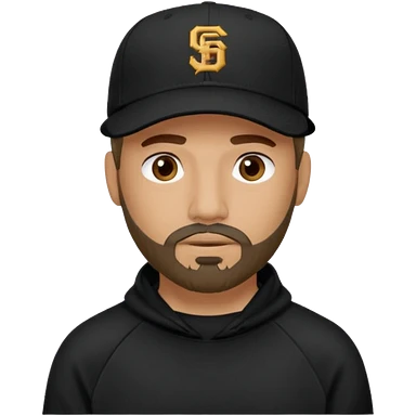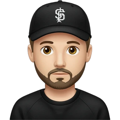 Hombre de ojos claros, con barba fina y perilla, gorra negra de baseball bordada, y sudadera negra emoji