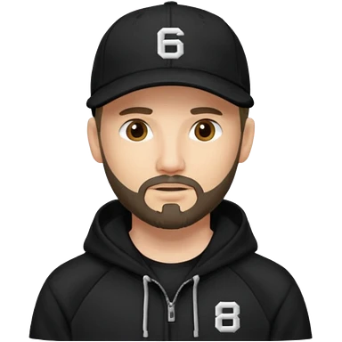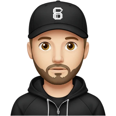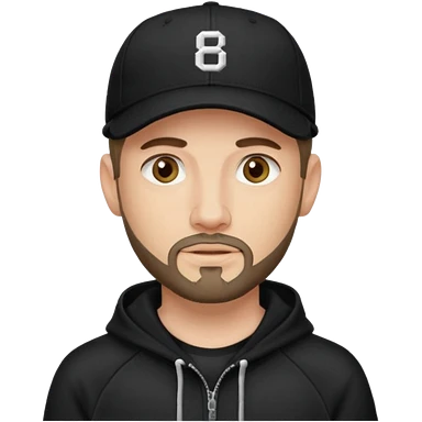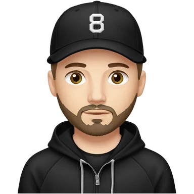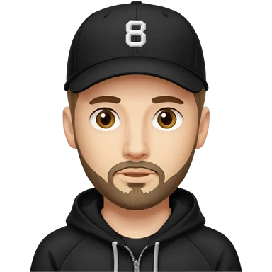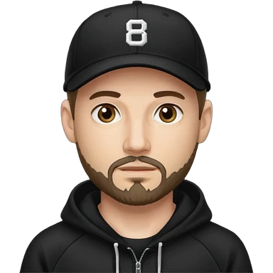 Hombre de ojos claros, con barba fina y perilla, gorra negra de baseball bordada con un 8, y sudadera negra emoji
