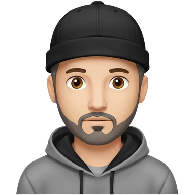 Hombre de ojos claros, con barba fina y perilla, gorra negra bordada, y sudadera gris. Expresión relajada y estilo urbano. emoji