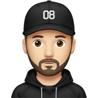 Hombre con la cara borrosa, con barba fina y perilla, gorra negra de baseball bordada con un 08, y sudadera negra emoji