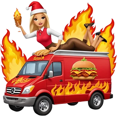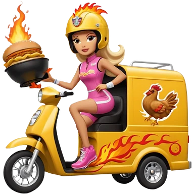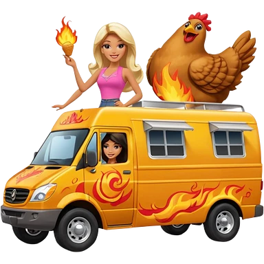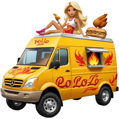 Hispanic pollo loco Barbie’s insanely flaming hot butt hurt burning chicken sandwich Extended length Sprinter 4500 van high roof off road rally delivery food truck capable of rock and desert racing emoji
