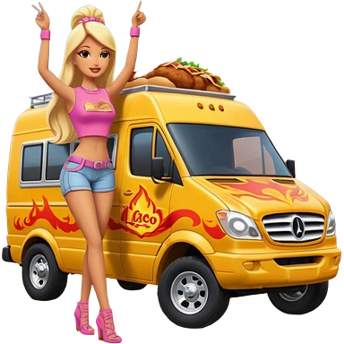 Hispanic pollo loco Barbie’s insanely flaming hot butt burning chicken sandwich Extended length Sprinter 4500 van high roof off road rally delivery food truck capable of rock and desert racing emoji