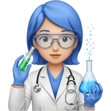 A person wearing safety goggles, a stethoscope, and a white coat. They are wearing blue protective gloves. In their hand, they are holding a test tube containing chemicals. emoji