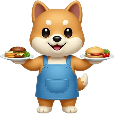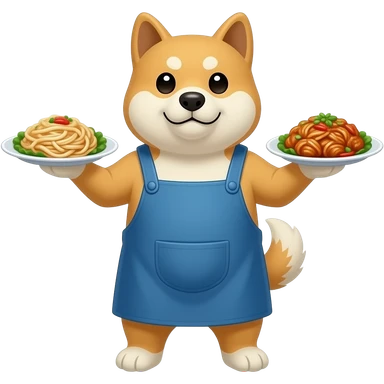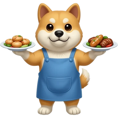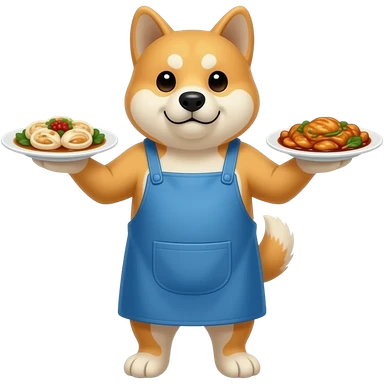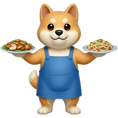 Hachiko dog in chibi cute animation standing on 2 legs , busy serving 2 plates of chinese food , with blue apron on emoji
