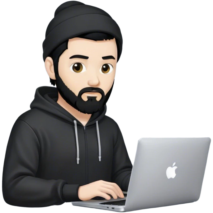 hackeur blanc cheveux noir barbe et capuche noir avec un macbook emoji | AI Emoji Generator