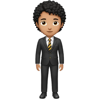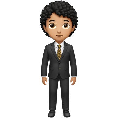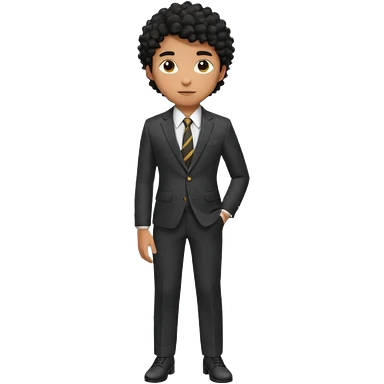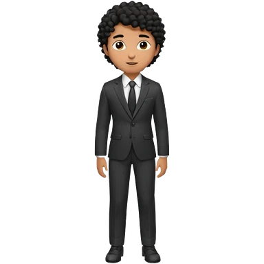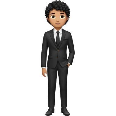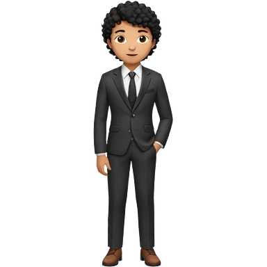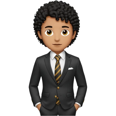 Young man, brown skin, black curly hair, tailored trousers, suit jacket, and tie, portrait emoji