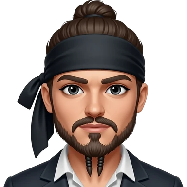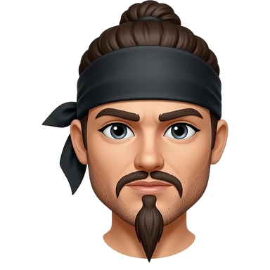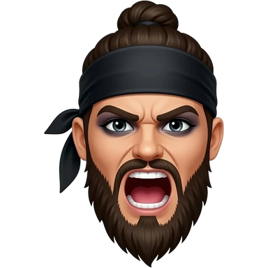 Hair color in pony /man bun/top knot black bandana more eyeliner trimmed full beard stubble with long goatee emoji | AI Emoji Generator