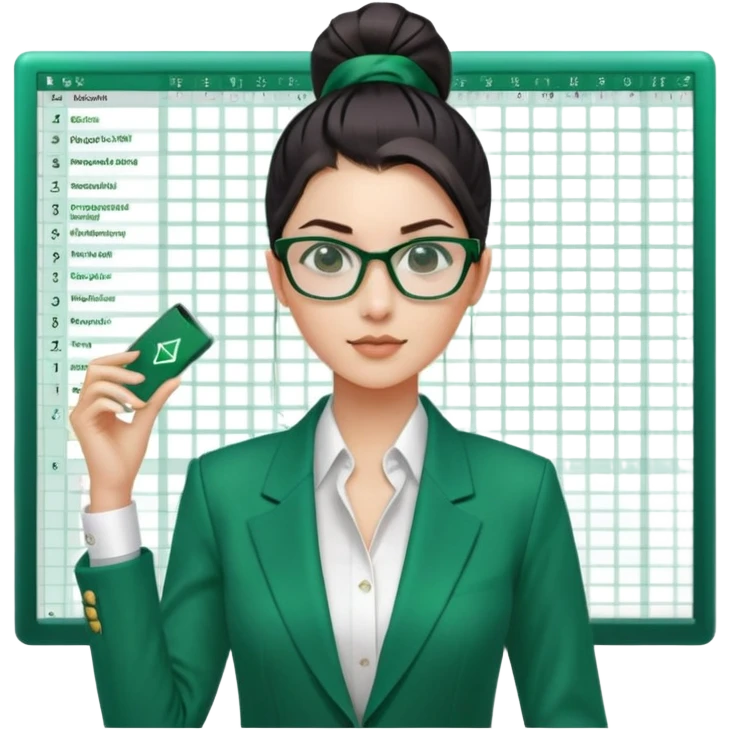 Hair: Sleek high ponytail with center parting Face: Narrow glasses reflecting spreadsheet grids Clothes: Emerald green blazer with rolled sleeves Action: Swiping between dual monitors rapidly emoji | AI Emoji Generator