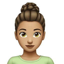 young girl with brunette hair tied up in a high bun and brunette hair, light green eyes emoji