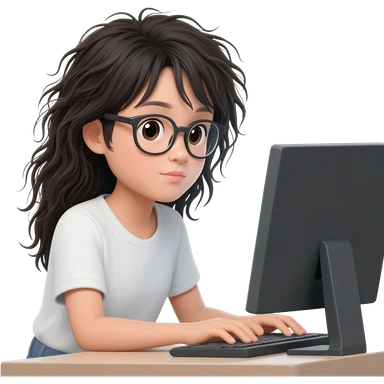 small-eyed girl with messy long hair and glasses working from home on PC half body and front view profile emoji