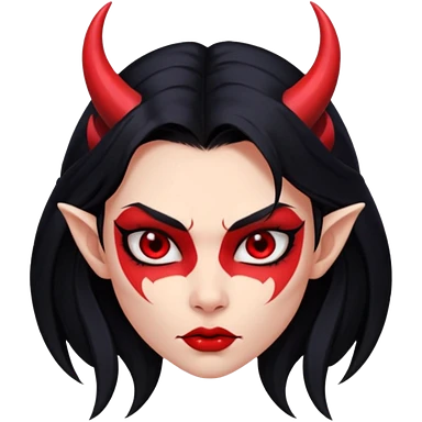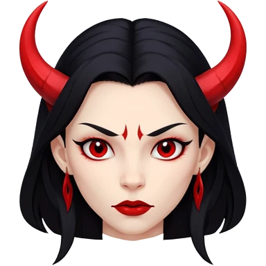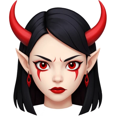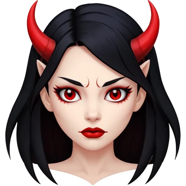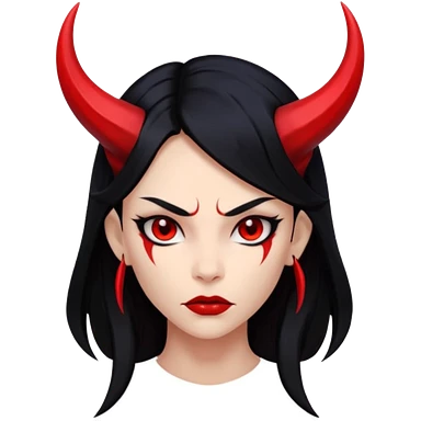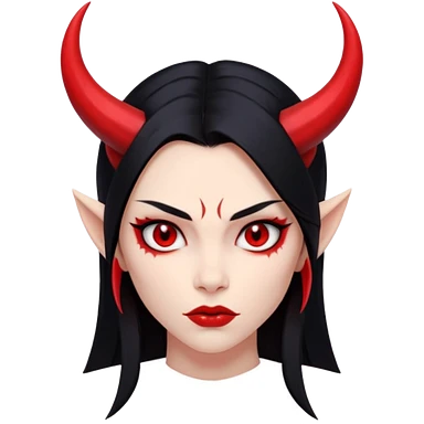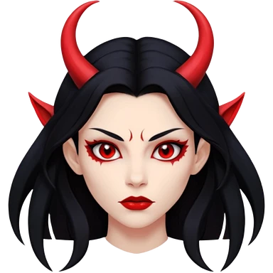 Head demon girl, strong pronounced cheekbones, sharp angular jawline, skin red everywhere, long straight sleek black hair, small horns emoji