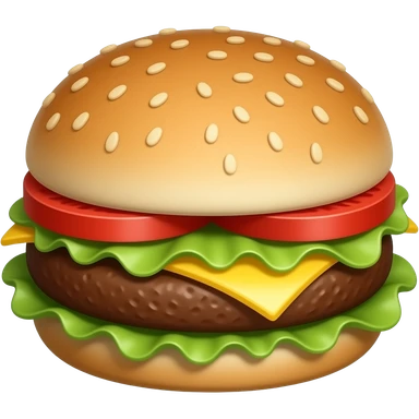 A classic single patty hamburger emoji,, glossy and colorful. Soft rounded bun with sesame seeds, one beef patty, fresh lettuce, tomato slice, melted cheese, realistic but cartoonish look, clean white background emoji