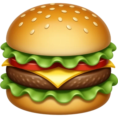 A classic single patty hamburger emoji,, glossy and colorful. Soft rounded bun with sesame seeds, one beef patty, fresh lettuce, tomato slice, melted cheese, realistic but cartoonish look, clean white background emoji