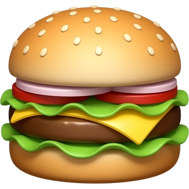 A classic single patty hamburger emoji, 3D Apple style, glossy and colorful. Soft rounded bun with sesame seeds, one beef patty, fresh lettuce, tomato slice, melted cheese, realistic but cartoonish look, clean white background emoji