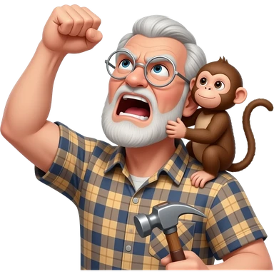grumpy angry old man yelling with round silver glasses and a plaid t-shirt shaking his fist and looking up at the sky with a hammer in his left hand and a baby monkey on his shoulder with his tail wrapped around the mans neck emoji