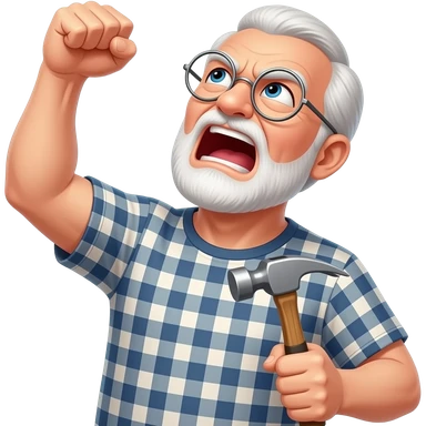 grumpy angry old man yelling with round silver glasses and a plaid t-shirt shaking his fist and looking up at the sky with a hammer in his left hand emoji