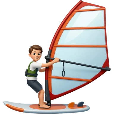 A windsurfer gliding across the water, with a vibrant sail catching the wind. The scene captures the motion of the board riding the waves, surrounded by the bright blue sky and ocean, symbolizing the excitement and skill required in the sport of windsurfing. emoji