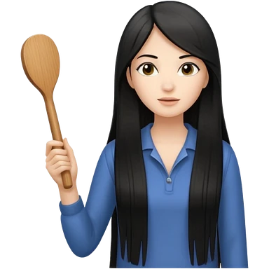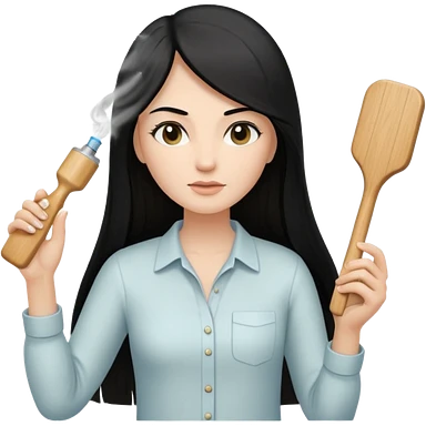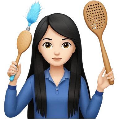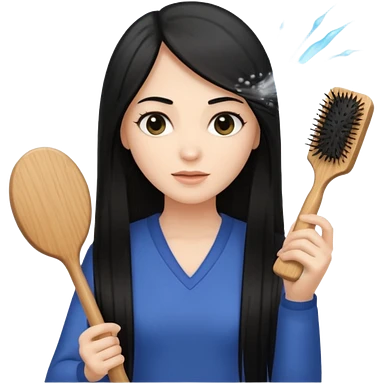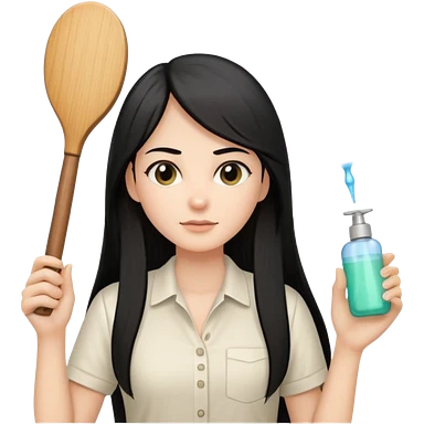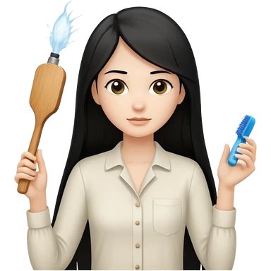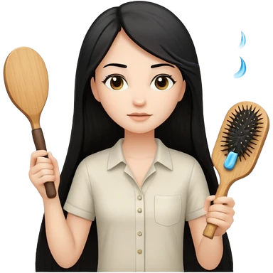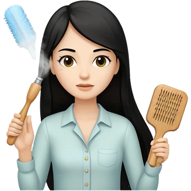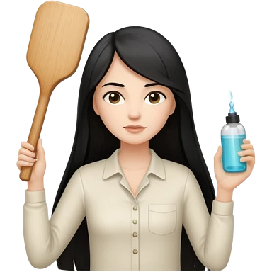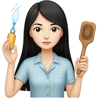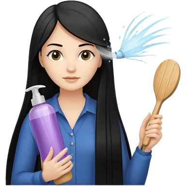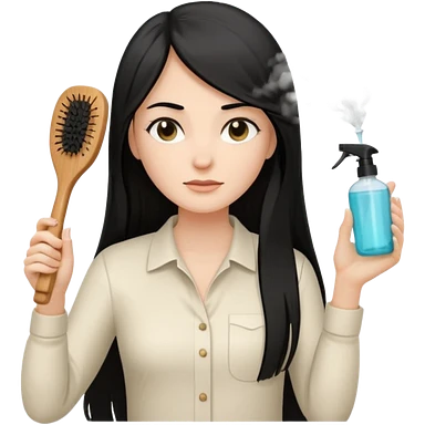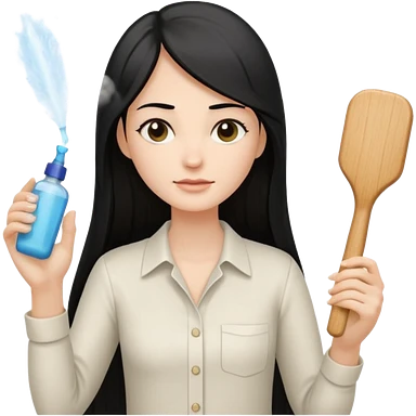 A white woman with long, straight black hair, holding a spray bottle in one hand and a wooden paddle hairbrush in the other. emoji