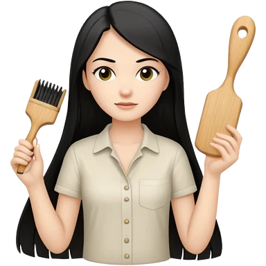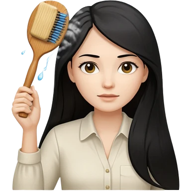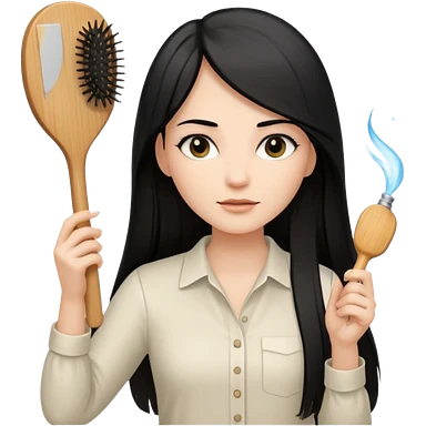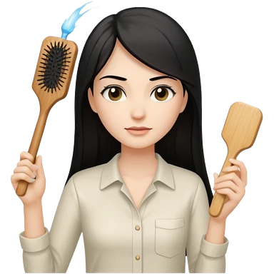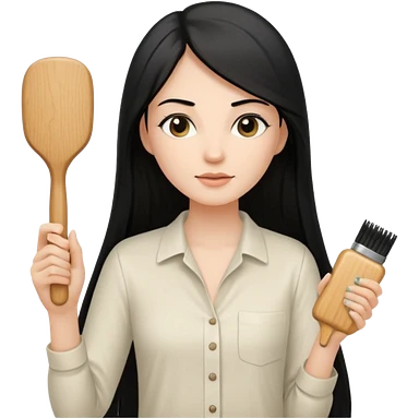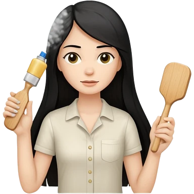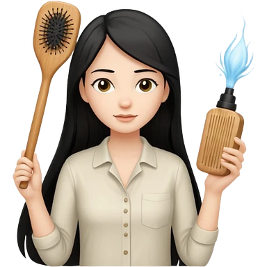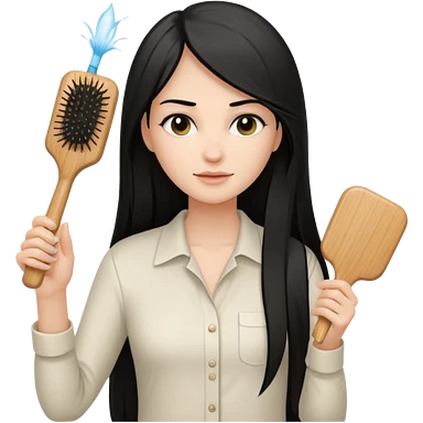 A white woman with long, straight black hair, wearing an ivory-colored shirt, holding a wooden paddle hairbrush in her left hand and spraying a hair mist bottle with her right hand toward her hair. emoji