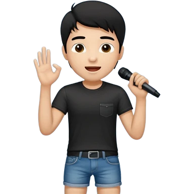 Handsome young man with black hair singing karaoke wearing an black t-shirt and denim shorts. emoji