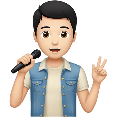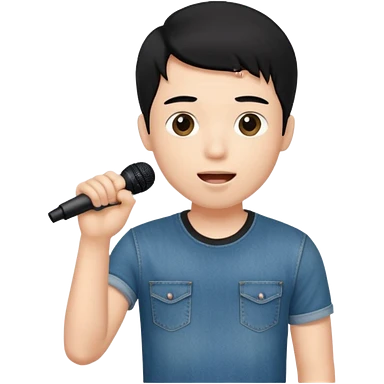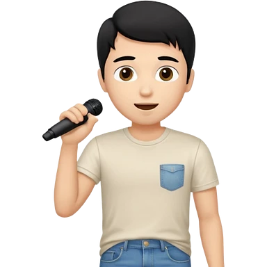 Handsome young man with black hair singing karaoke wearing an ivory t-shirt and denim shorts. emoji