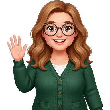 detailed emoji illustration of a curvy woman with long light brown wavy hair, light brown eyes and round glasses waving with one hand, wearing a dark old green cardigan, friendly and cheerful expression, cute emoji style emoji
