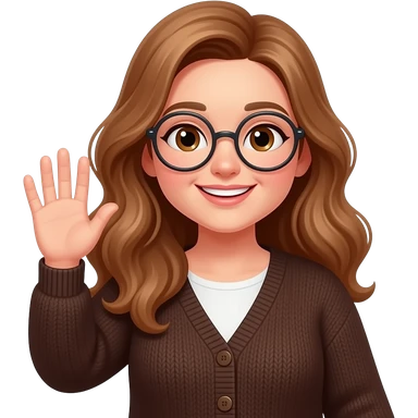 detailed emoji illustration of a curvy woman with long light brown wavy hair, light brown eyes and round glasses waving with one hand, wearing a dark old brown cardigan, friendly and cheerful expression, cute emoji style emoji