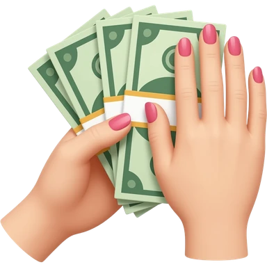 A stack of bills, a neat hand painted with rose-pink nail polish, a hand with fair skin emoji