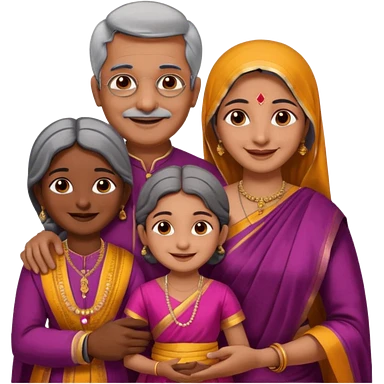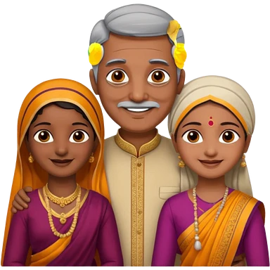 Indian family with a 70 years old father and mother and a 40 years old daughter. They wear a traditional dress. They are smiling. emoji