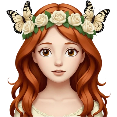 Woman with long flowing auburn hair wearing a flower crown with white and cream colored roses and butterflies in it emoji