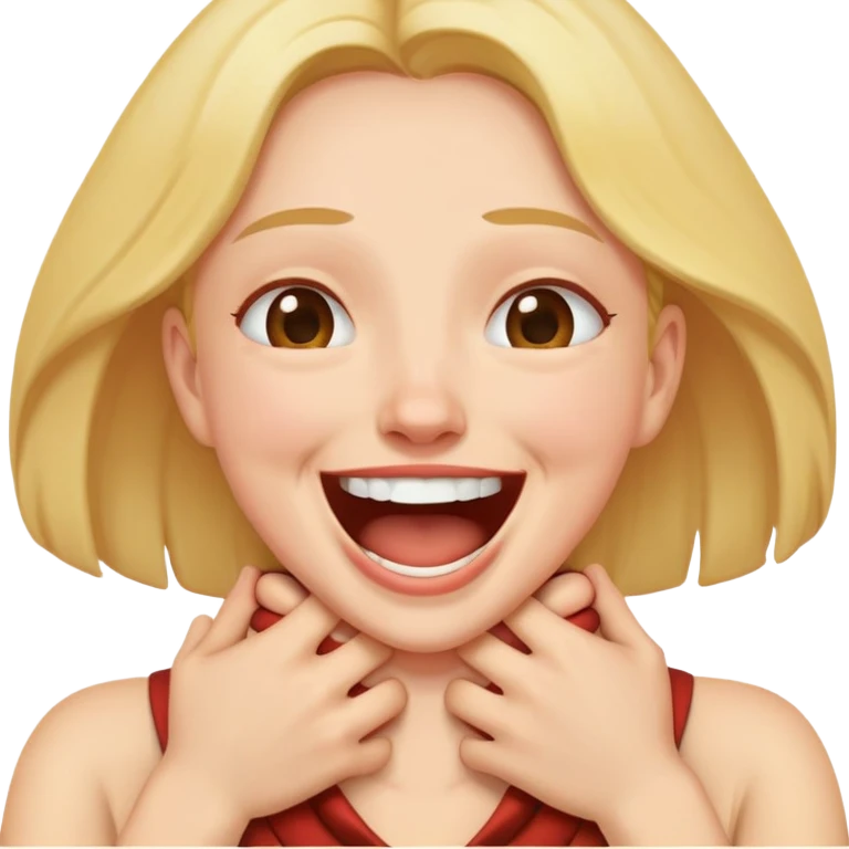 Woman choking herself with her hands around her neck while laughing with her eyes closed emoji