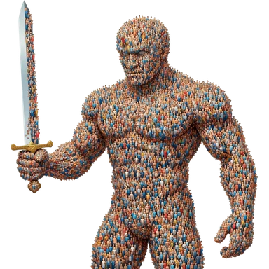 A colossal crowned humanoid figure made of thousands of tiny human bodies forming its skin, symbolizing a collective sovereign, holding a sword in one hand emoji