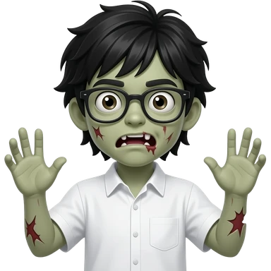 young, black medium hair, glasses, white shirt, hands up boy zombie emoji emoji