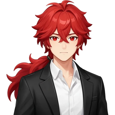 Handsome gorgeous anime man with bright-red hair, thick long messy wavy ponytail, red eyes, white shirt, black jacket, stone face, Diluc from Genshin Impact emoji